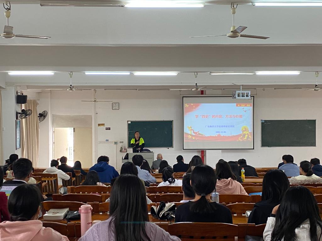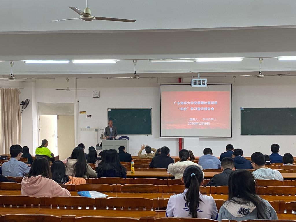 12月9日下午,在第二教学楼b5302,学校党委理论宣讲团成员李林杰博士为学院全体教职工宣讲“四史”和党的十九届五中全会精神。