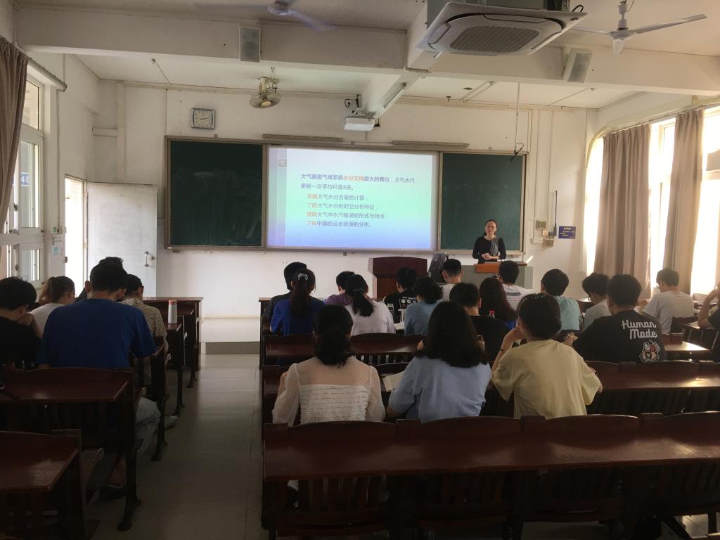 范伶俐老师以《大气中水分》为题讲课,首先,开展课程回顾,引导学生重温气候系统中的水分循环、蒸发、降水及径流的相关知识。借助实际业务中大气可降水量的概念引入,使学生掌握了大气水分含量的计算方法;在中国云水资源分布的讲解中,引入课程思政点:厚植家国情怀,践行初心使命,为建设社会主义现代化强国贡献更多气象力量——向在江西吉安人工增雨作业中牺牲的单良、李鹏、彭亮同志学习,激发了学生的学习兴趣。