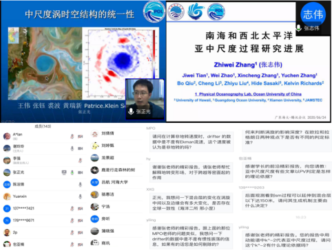 张志伟副教授则对“南海和西北太平洋亚中尺度过程研究进展”进行了详细介绍。他首先介绍了亚中尺度的概念、研究意义与分类,以及上层海洋中的亚中尺度过程和亚中尺度相干涡旋,进而提出上层亚中尺度过程与亚中尺度相干涡旋间动力联系的科学问题,继而介绍了利用观测和数值模拟相结合的方法对该问题的相关研究,最后还展示了针对亚中尺度研究的最新潜标阵列观测及其初步结果。报告对目前较为前沿的亚中尺度研究相关问题进行了全方位的梳理,使得师生们获益匪浅,对海洋亚中尺度过程有了更深入的认识。