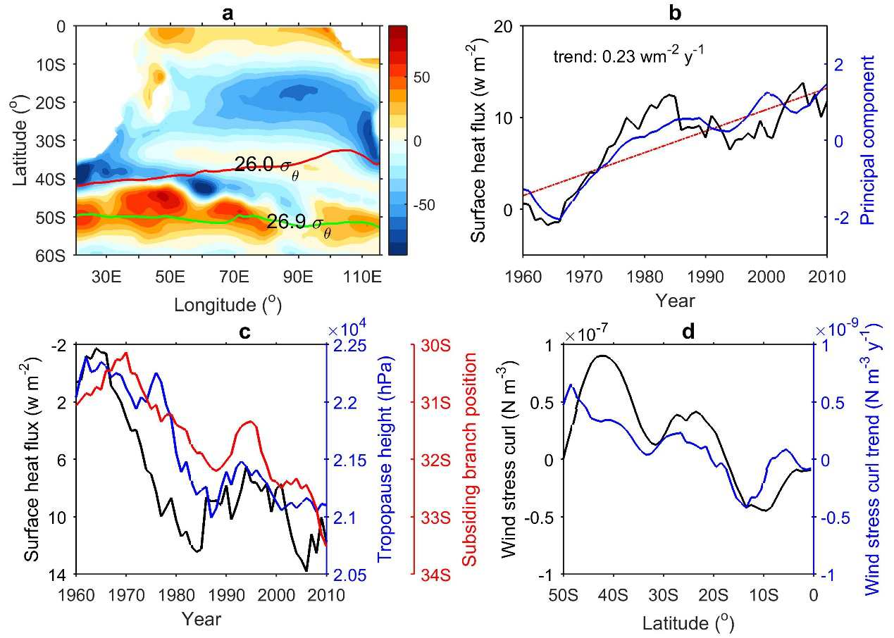 图2 (a) 1960-2010年平均海表净热通量(w m-2). (b) 26.0和26.9σθ等密度面在南大洋露头区域平均的海表净热通量(黑线)及其趋势(红线). (c)26.0和26.9σθ等密度面在南大洋露头区域平均的海表净热通量(黑线),对流层高度(蓝线)和Hadley环流下沉支纬度(红线). (d) 1960-2010年平均、纬向平均风应力旋度(黑线)及其趋势(蓝线)。