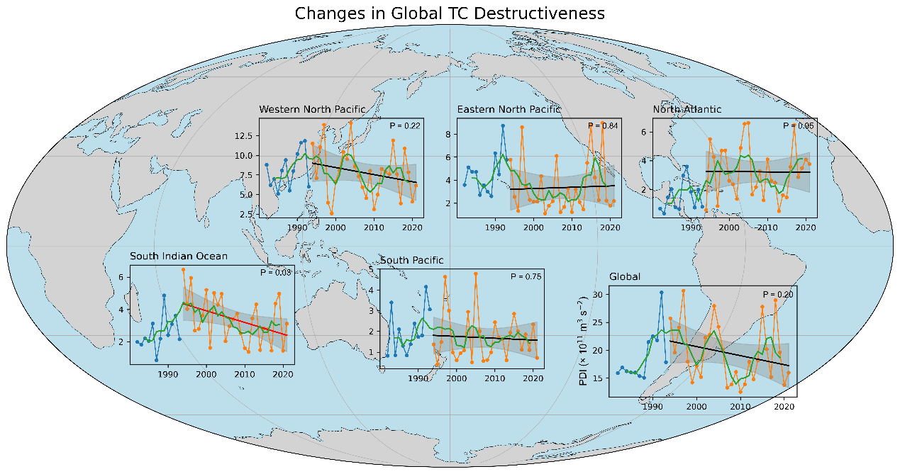图1 | 热带气旋年累积功率耗散指数(PDI)在每个海盆和全球的时间序列。阴影区域是线性拟合直线的双边95%置信区间;实线(红色为线性趋势显著,黑色为不显著)代表自20世纪90年代中期以来的线性回归;绿色曲线代表PDI的五年滑动平均。