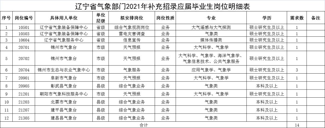 附件1:辽宁省气象部门2021年补充招录应届毕业生岗位明细20210608.xls