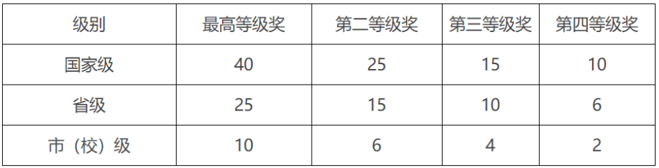 各类奖项完成者中排名第二至第五的学生分数分别=排名第一分数×0.6、0.5、0.4、0.3。同一项目获不同级别奖励,不重复计分。