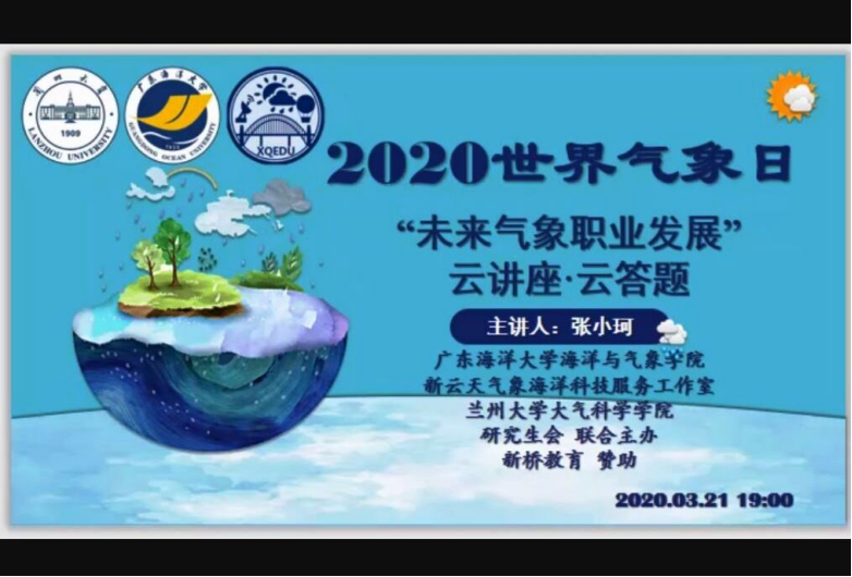 3月23日,是第60个世界气象日。为纪念世界气象组织成立,广泛宣传气象工作,提升对气象研究兴趣,3月20至21日,william英国中文新云天气象海洋科技服务工作室与兰州大学大气科学学院研究生会通过互联网联合举办了三场主题“云活动”。来自我校及兰州大学、南京信息工程大学、中山大学等高校的老师和学生近1200人次参加了各项活动。活动得到校党委宣传部海浪传媒、兰州大学安特莫斯俱乐部等部门和网易网站、新桥教育等单位的大力支持。