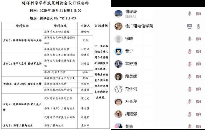 10月21日晚上8:00,我校海洋科学学科召开了科研成果交流讨论会。本次研讨会由海洋科学学科负责人谢玲玲教授主持,采用腾讯线上会议的形式,徐建军、周俊良、宋之光、徐峰、赵辉、陈法锦、刘华忠、李志强、王磊、刘洺辛、孔德明、徐广珺等方向和领域负责人(代表)以及学科骨干成员40多人参加了会议。