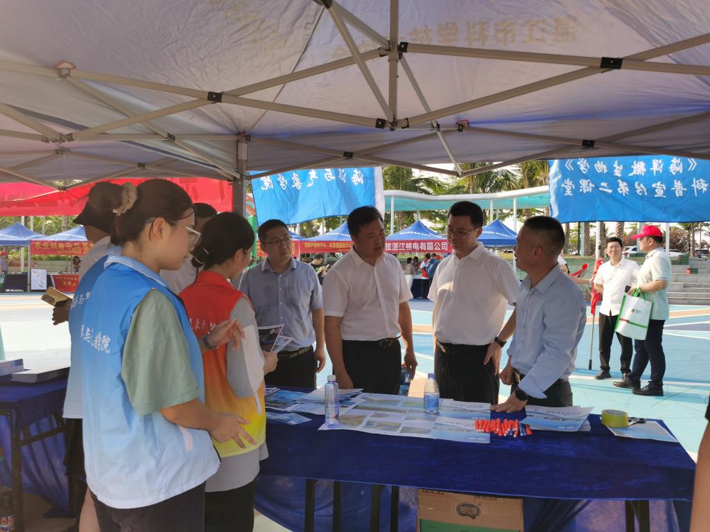 在活动现场,学院设置的摊位前吸引了不少前来参加活动的人们,他们驻足观看,对“蓝眼泪”、看云识天气、湖光岩地质等知识十分感兴趣,林海峰老师带领同学们对他们提出的问题一一解答,并发放宣传资料。湛江市科协主席郭荣波等市领导对学院开展科普工作取得的成绩给予肯定并寄以希望。