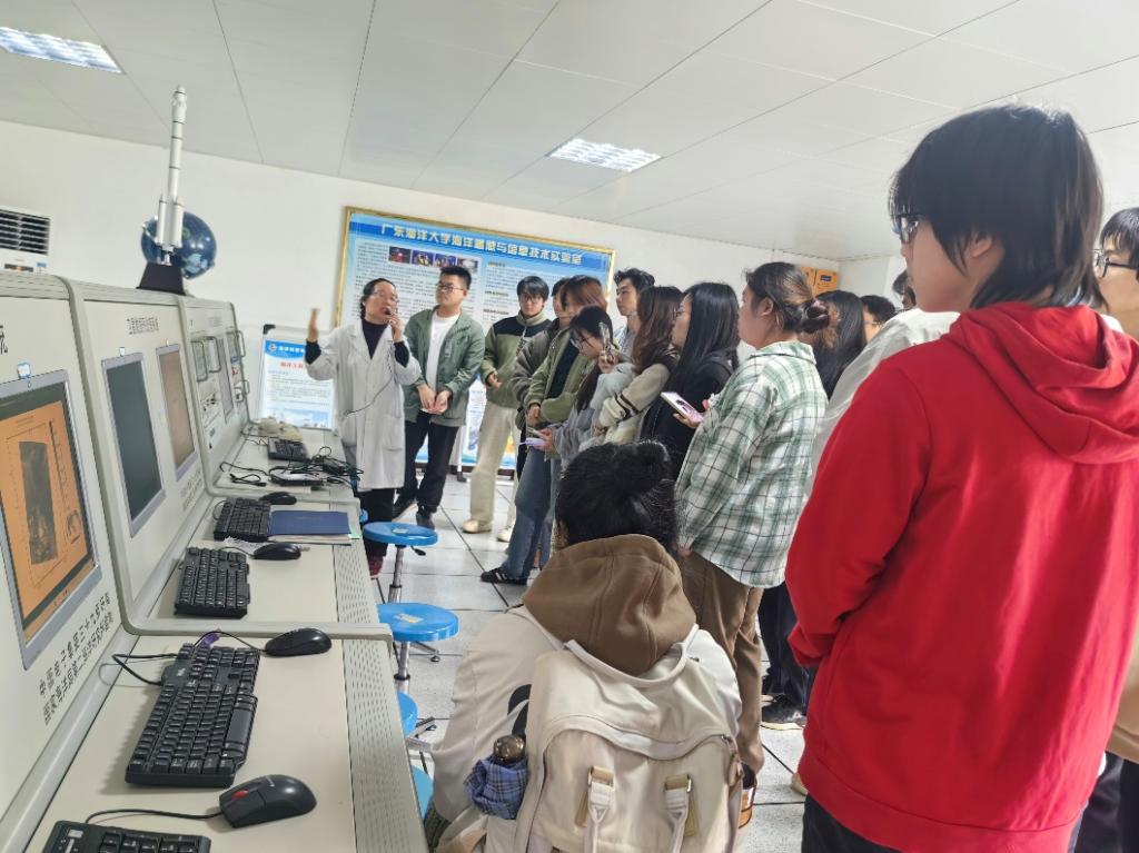 同学们接下来参观了“全国海洋科普教育基地”-williamhill英国海洋遥感与信息技术实验室。参观过程中,工作人员首先介绍了卫星遥感技术的基本原理及其在海洋科学研究中的重要性,随后工作人员详细讲述了遥感实验室的发展历程,以及实验室数据来源、数据接收、数据整理、数据分析的具体过程,还展示了实验室在南海海洋资源探索、海洋环境监测以及生态变化等研究方面做出的重要成果。通过工作人员的讲解,同学们了解了遥感技术在海洋生态系统监测和海洋环境监测等方面的重要作用,也认识了卫星数据接收系统、数据处理服务器和遥感图像处理软件的基本工作原理,使学生对遥感数据分析有了更直观深入的认识。