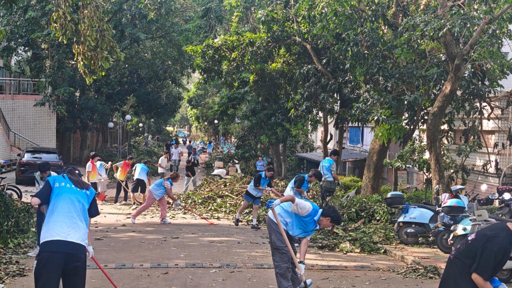 清理现场,师生们利用铁锹、扫帚等工具分工协作,高效作业。一组人员负责搬运断裂的粗大树枝,全力疏通主干道;另一组则集中清扫落叶、装运杂物,并对积水退去后的淤泥区域进行重点清理。整个过程衔接有序,展现了高效的团队协作能力。