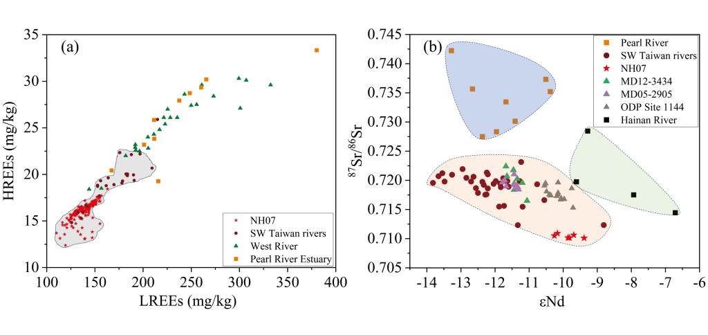 我院海洋地质团队成员黄超副教授以南海北部陆坡的NH07岩心为研究对象(图1),通过高分辨率的地球化学和粒度分析,重建末次冰消期以来南海北部陆坡沉积物的源–汇过程,并探讨其对气候变化和黑潮入侵南海的响应机制。稀土元素和Sr–Nd同位素分析表明,台湾西南部河流是NH07岩心沉积物的主要来源(图2)。粒度敏感组分分析发现,敏感粒度组分2(24.7–27.9 μm)可以用于示踪黑潮入侵南海的可靠指标,从而重建了末次冰消期以来黑潮入侵南海的演化历史。研究结果表明,黑潮入侵南海北部的强度与开放太平洋黑潮主轴的强度呈现反相关关系,主要受东亚季风和ENSO活动的调控(图3)。在末次冰消期(16, 000–11, 700 cal yr BP),黑潮入侵南海北部的强度较大,沉积物来源和输运主要受海平面变化与黑潮入侵强度的共同驱动,而化学风化强度主要受控于低海平面暴露的陆架物质再风化作用影响;全新世时期(11, 700 cal yr BP–至今),黑潮入侵南海北部的强度整体较弱,东亚夏季风成为控制陆源物质输运和化学风化强度的主要因素。该研究深化了对边缘海沉积系统响应季风气候演变、海平面变化和海洋环流格局的理解。