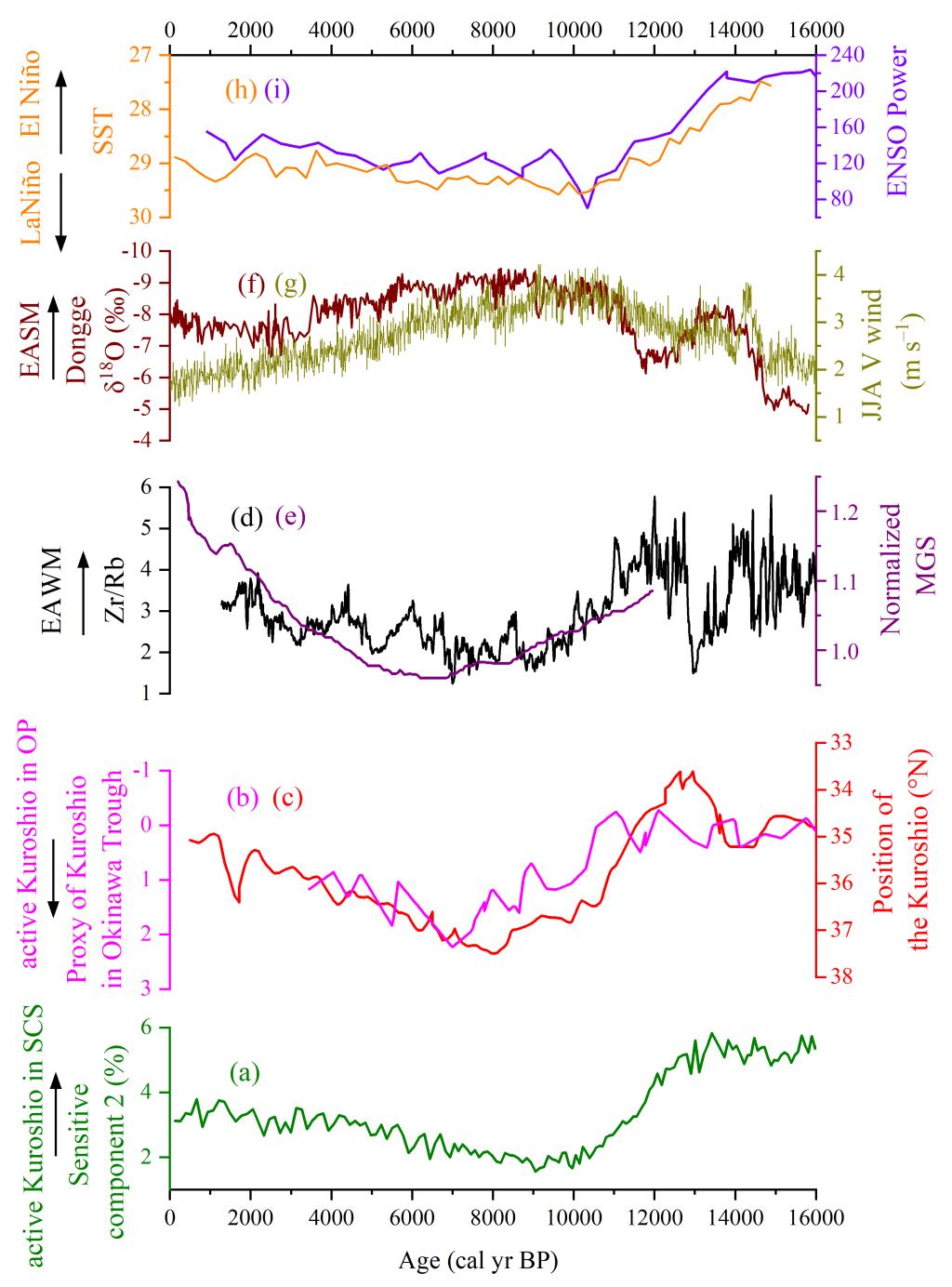 图3末次冰消期以来黑潮入侵强度与东亚季风和ENSO活动的关系。图a为本研究敏感粒度组分2指示的黑潮入侵南海的强度变化;图b和c为开放太平洋黑潮主轴的强度;图d和e为东亚冬季风记录;图f和g为东亚夏季风记录;图h和i为ENSO活动记录。