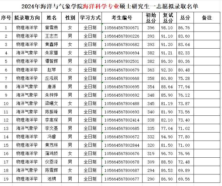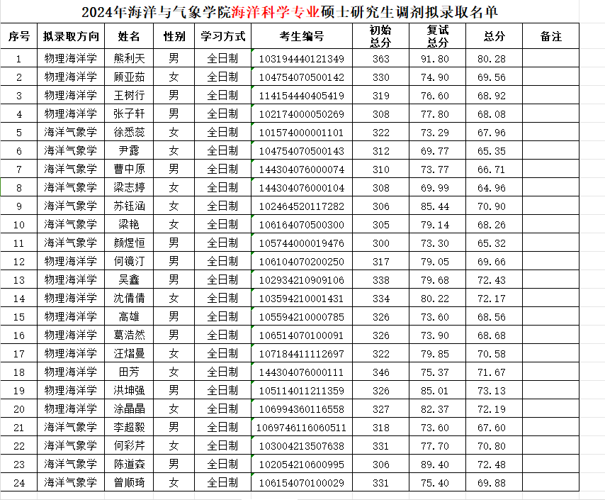 现将william英国中文海洋科学专业2024年硕士研究生一志愿及调剂拟录取学生名单予以公示,公示期为3个工作日,即4月26日-4月28日。公示期内如对结果有异议,可以书面形式向学院予以提出。