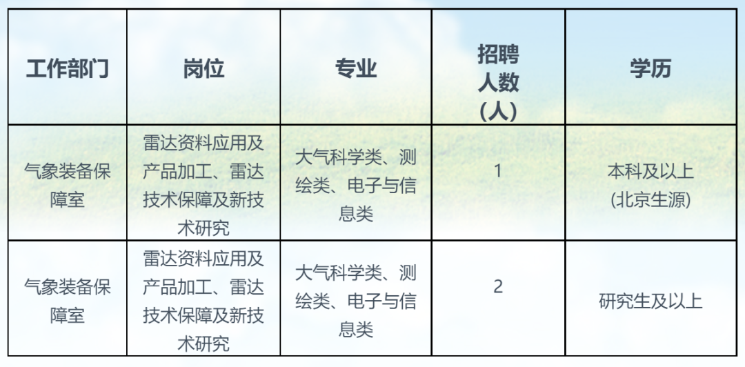 为加强国家级探测业务人员的队伍建设,现探测中心向各高等院校、科研院所招收应届毕业生,招聘需求如下: