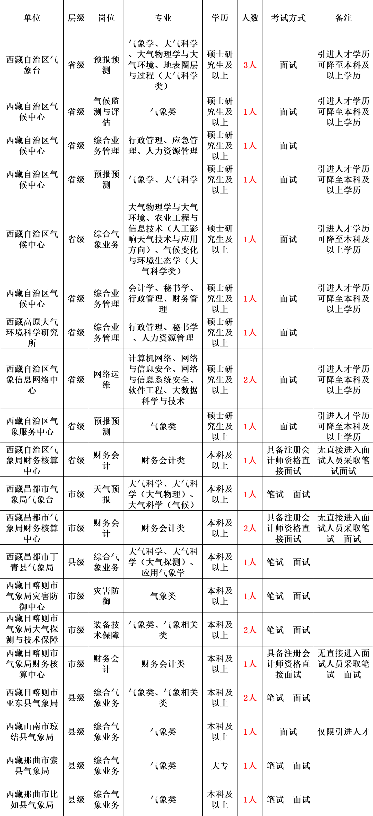 考试时间:采取直接面试的岗位,根据疫情防控有关要求,采取现场面试或远程面试等方式进行,具体根据直接报名面试岗位的人员情况确定。需“笔试 面试”的岗位,拟定于2022年1月上旬在拉萨集中组织笔、面试,具体时间将从气象人才招聘系统短信通知,届时请保持通讯畅通并及时留意通知信息。笔试考试不指定参考书目。