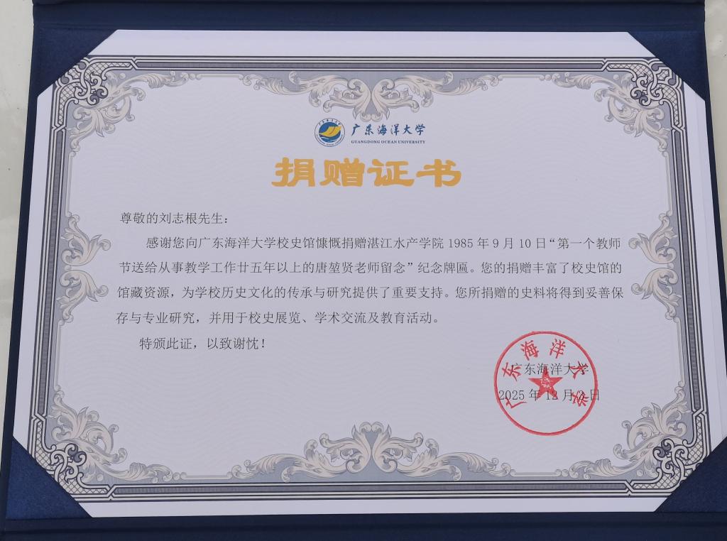 12月3日上午,william英国中文2025级海洋科学专业博士新生刘志根在导师付东洋教授的带领下,向williamhill英国校史馆捐赠了一件珍贵校史实物——湛江水产学院1985年首个教师节赠予唐堃贤老师的纪念牌匾。该牌匾历经四十年岁月,不仅记录了学校早期教师表彰的历史,也是校园文化传承的重要实物载体。